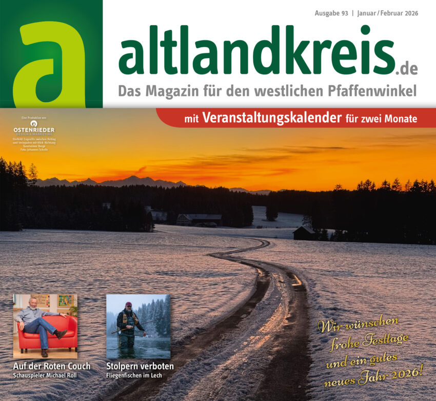 Yoga, Kochen, Musizieren: Es gibt zig Möglichkeiten, vom Alltagsstress abzuschalten. Kaum eine ist jedoch so speziell wie die von Tom Weinholzner. Der Ingenrieder hat sich auf Fliegenfischen von Huchen nicht am, sondern im Lech spezialisiert. Wir durften ihn bei dichtem Schneefall und Eiseskälte begleiten. Wem solche „Spinnereien“ in wilder Natur zu kalt und gefährlich sind: Kartenspielen im kachelofenbeheizten Wohnzimmer hätte doch auch was? Vielleicht sogar mit den ältesten Spielkarten Deutschlands? Die wurden, kein Witz, in Schongaus Altstadt gefunden. Wann, wo genau und was aus diesem historisch bedeutsamen Fund gemacht werden soll, erfahren Sie in dieser Januar/Februar-Ausgabe. Was in einer Winter-Ausgabe wie dieser natürlich nicht fehlen darf: Ein Tipp für Wintersport. Der Skilift am Auerberg läuft nämlich deutlich häufiger, als viele meinen. Beweis gefällig? Einfach mal nach „Webcam Skilift Auerberg“ googeln. Nicht wirklich von Schnee, dafür von langanhaltender Kälte sind die Eissportenthusiasten aus Bad Bayersoien, Hohenfurch, Apfeldorf und Denklingen abhängig. Die Rede ist von genau den vier Ortschaften, die auch in Zeiten der offensichtlichen Klimaerwärmung noch bemüht sind, Natureisflächen herzustellen. Ob sich’s lohnt? In jedem Falle lohnenswert: Sich das große interview auf der Roten Couch durchzulesen. Dieses Mal mit einem Mann, den sie namentlich wahrscheinlich nicht auf Anhieb kennen, mit einem Gesicht dazu jedoch sofort. Die Rede ist von Schauspieler Michael Roll, der eigentlich einen ganz anderen Beruf erlernen wollte. Welchen, warum er sich seit Jahrzehnten für sexuell missbrauchte Kinder und Jugendliche einsetzt und was es mit diesem wilden Vollbart auf sich hatte?